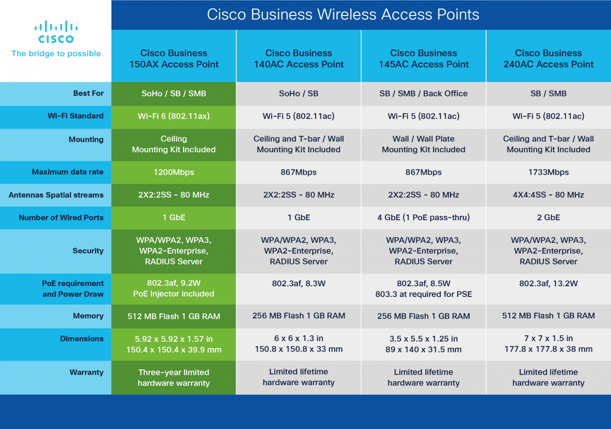 Cisco Business 150AX Wi-Fi 6 2x2 Access Point 1 GbE Port, Ceiling Mount, PoE Injector Included, 3-Year Hardware Protection (CBW150AX-E-UK) | Compatible with CBW150AX and CBW151AXM Mesh Extender. 2.4 GHz, 5 GHz, Maximum data transfer rate: 1200 Mbit/s. Security algorithms: EAP-FAST, EAP-GTC, EAP-PEAP, EAP-SIM, EAP-TLS, EAP-TTLS, WPA, WPA2, WPA3. Ethernet LAN data rates: 10,100,1000 Mbit/s. Power over Ethernet (PoE). Product colour: White