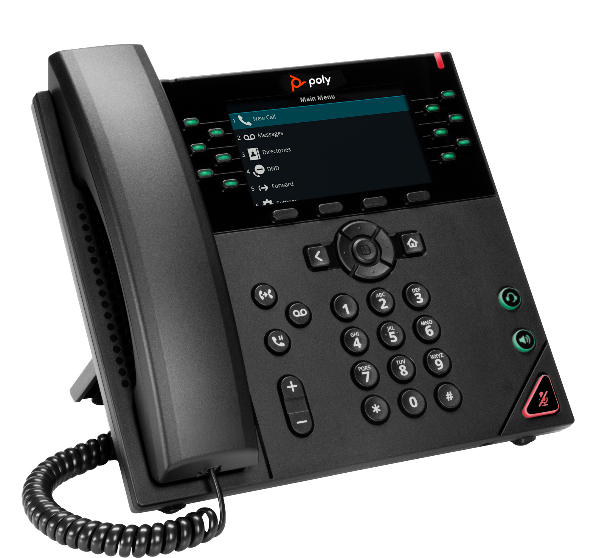 4-way navigation cluster with a center select key and a 12-key dial pad with controls for mute, speaker, and headset volume.